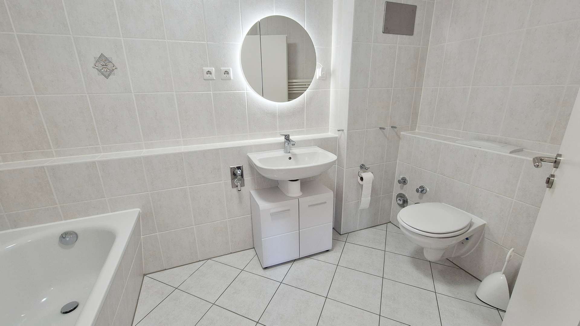 Bad: neue Sanitärkeramik, Badewanne, Armaturen, Spiegelschrank, Waschbeckenunterschrank und Deckenleuchte